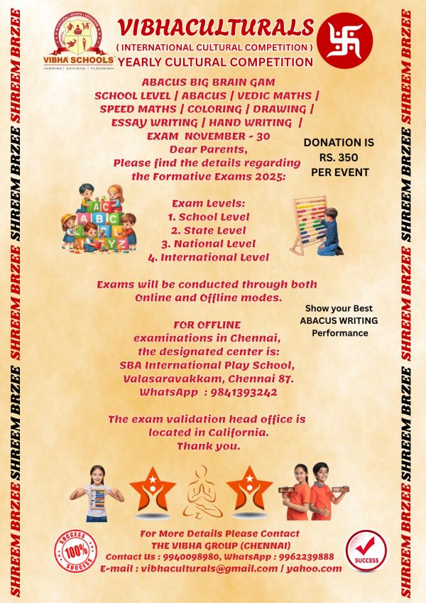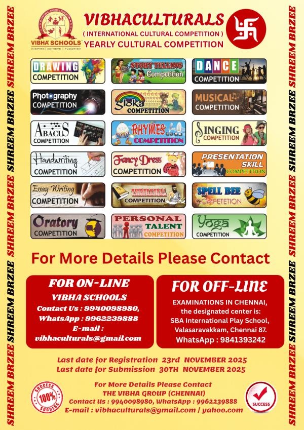 We are delighted to invite you to participate in VIBHACULTURALS, an International Cultural Competition designed to give children and youth a global platform to express their inner creativity and unique talents.