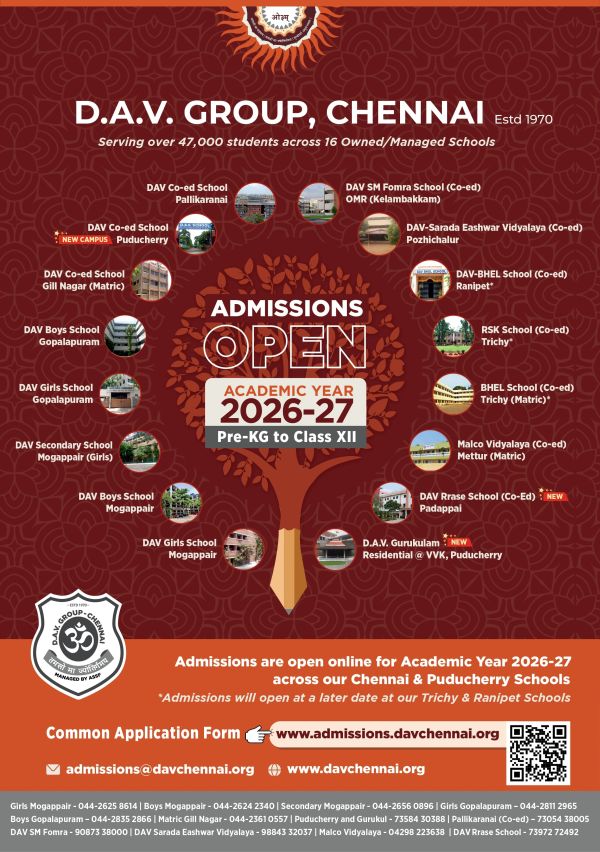 Admissions are now open for D.A.V. Group of Schools for the Academic Year 2026-27 for Pre-KG to Class XII across all schools through a common application form.